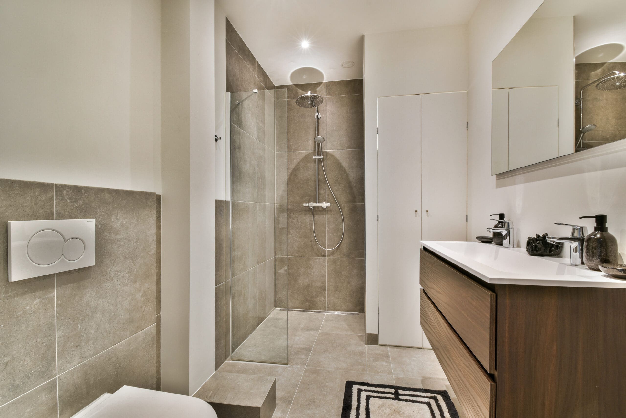 Entrance hall providing access to all rooms. At the front of the apartment is the spacious and bright living room with an adjoining dining area. At the rear are the modern kitchen and two generously sized bedrooms. Both the kitchen and the master bedroom offer access to a sunny southeast-facing balcony. The kitchen is equipped with built-in appliances including a combination oven, dishwasher, fridge with freezer compartment, and a 4-burner gas hob. Centrally located is the luxurious bathroom, fitted with a toilet, walk-in shower, double washbasin with vanity unit, and a connection for a washing machine and/or dryer.