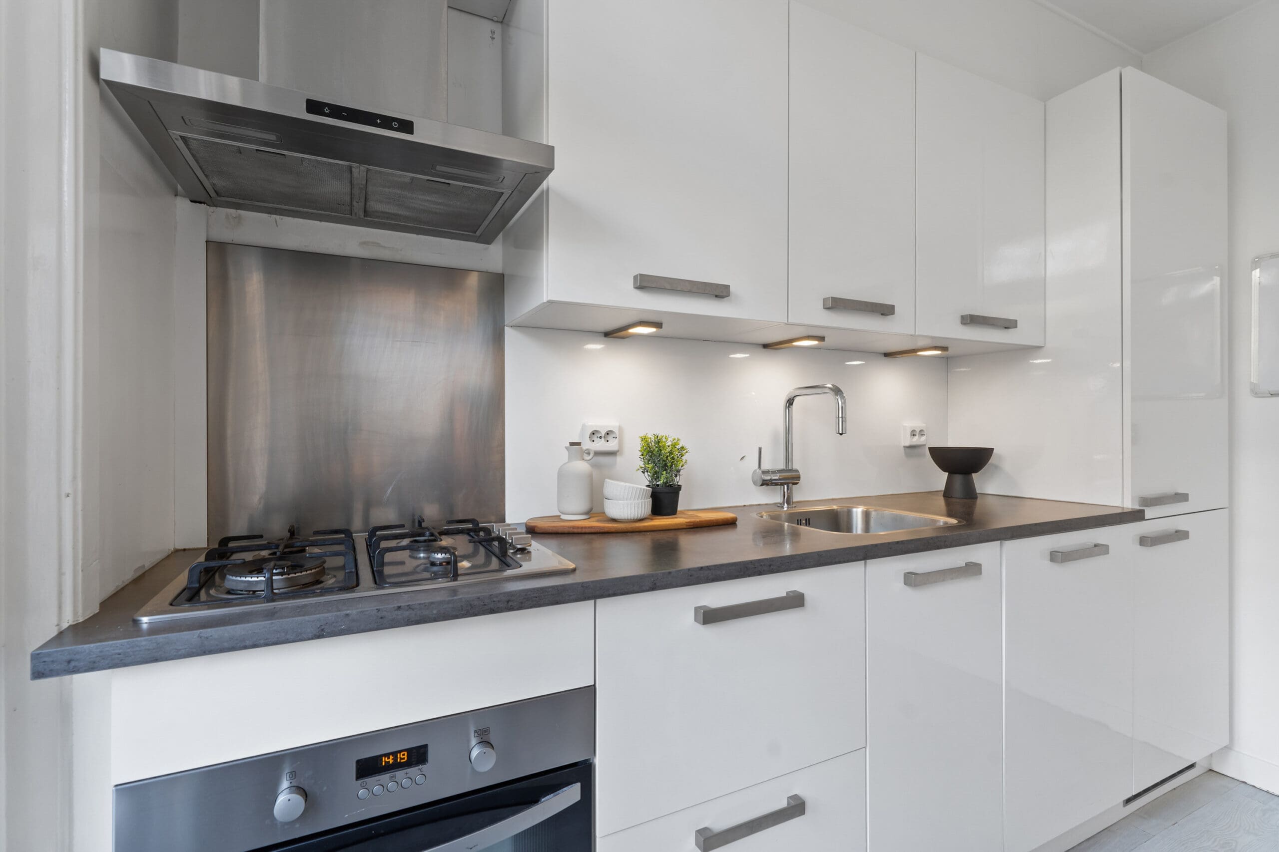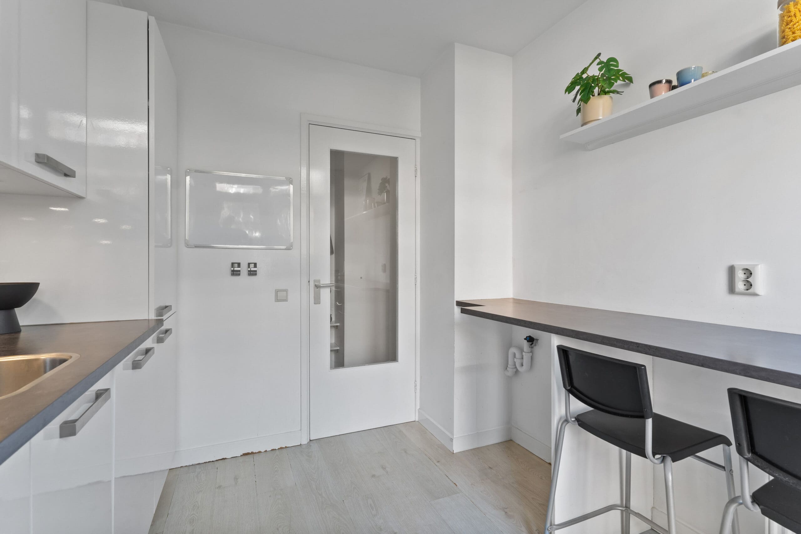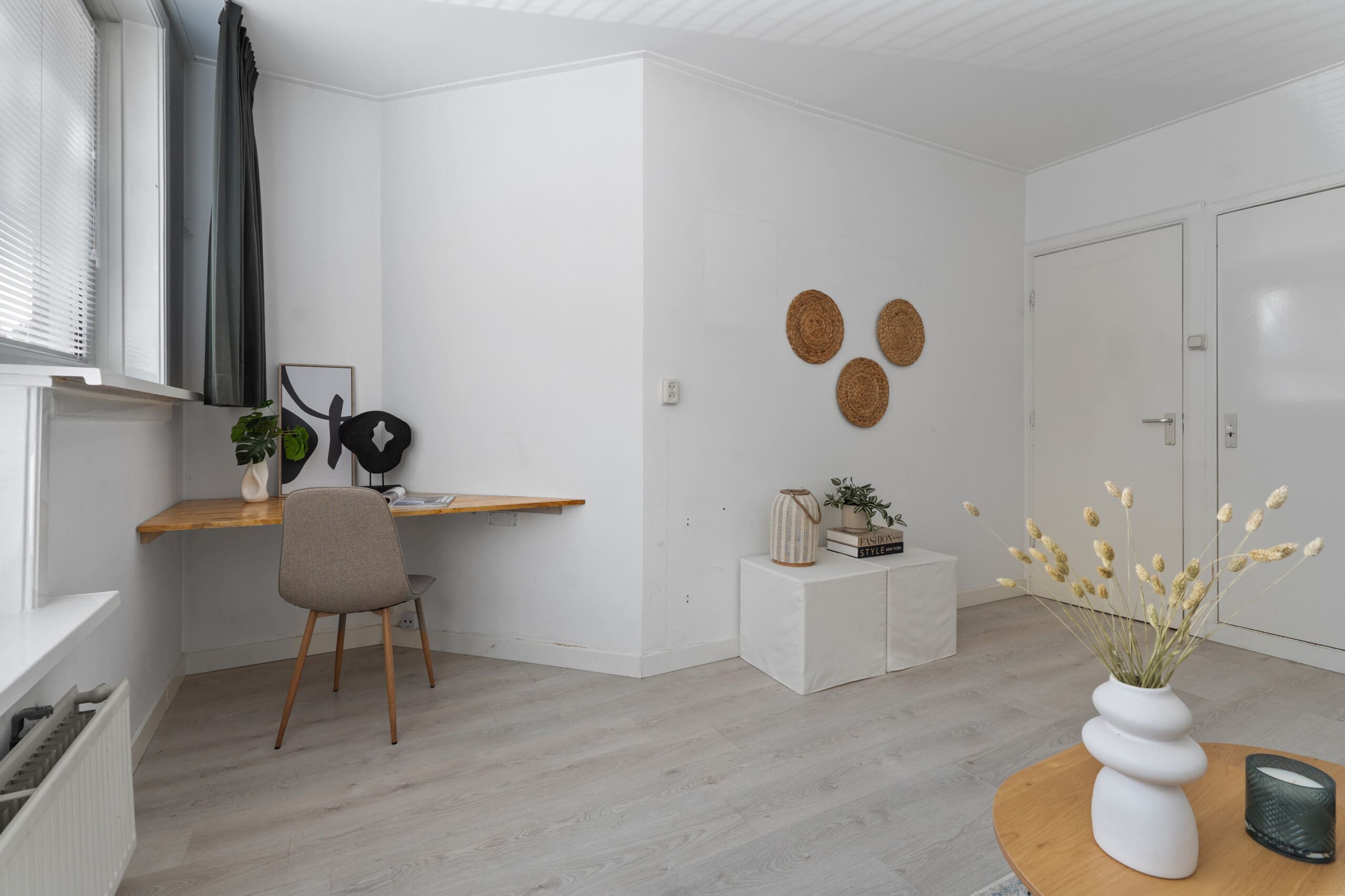 The kitchen, also at the rear, is fitted with a dishwasher, 4-burner gas stove, oven, and fridge/freezer. There’s also a washing machine connection. A wall-mounted breakfast bar is located opposite the countertop – the perfect spot for your morning coffee or a glass of wine while cooking. The kitchen also provides direct access to the terrace. The west-facing terrace enjoys afternoon and evening sun and borders the well-maintained, peaceful communal garden of the homeowners' association (VvE), giving you a sense of privacy and greenery. A utility cabinet on the terrace keeps the central heating system neatly out of sight.