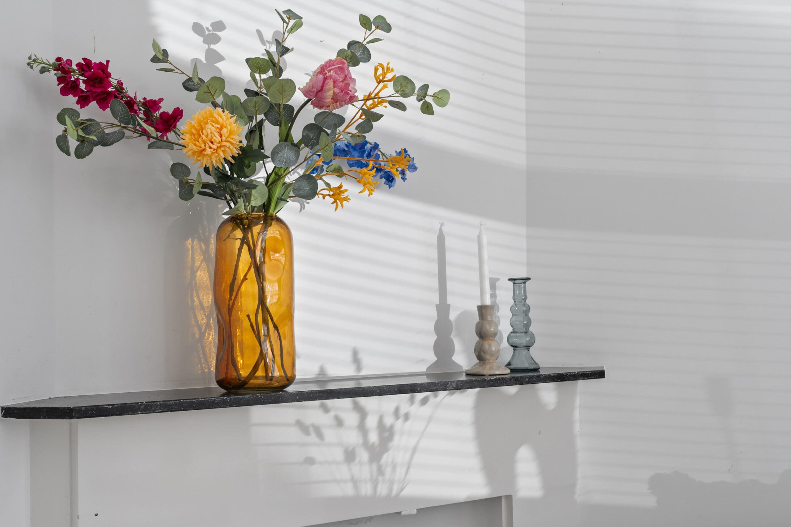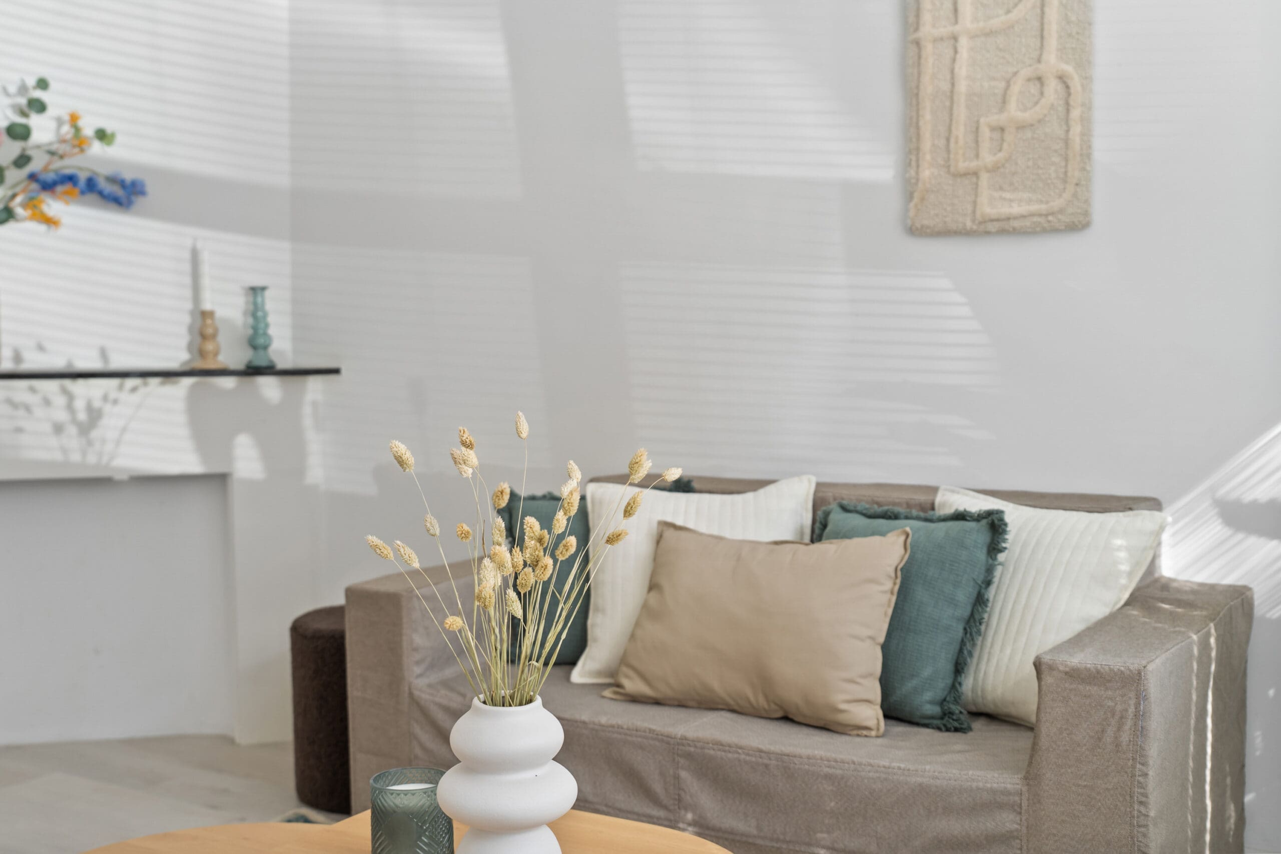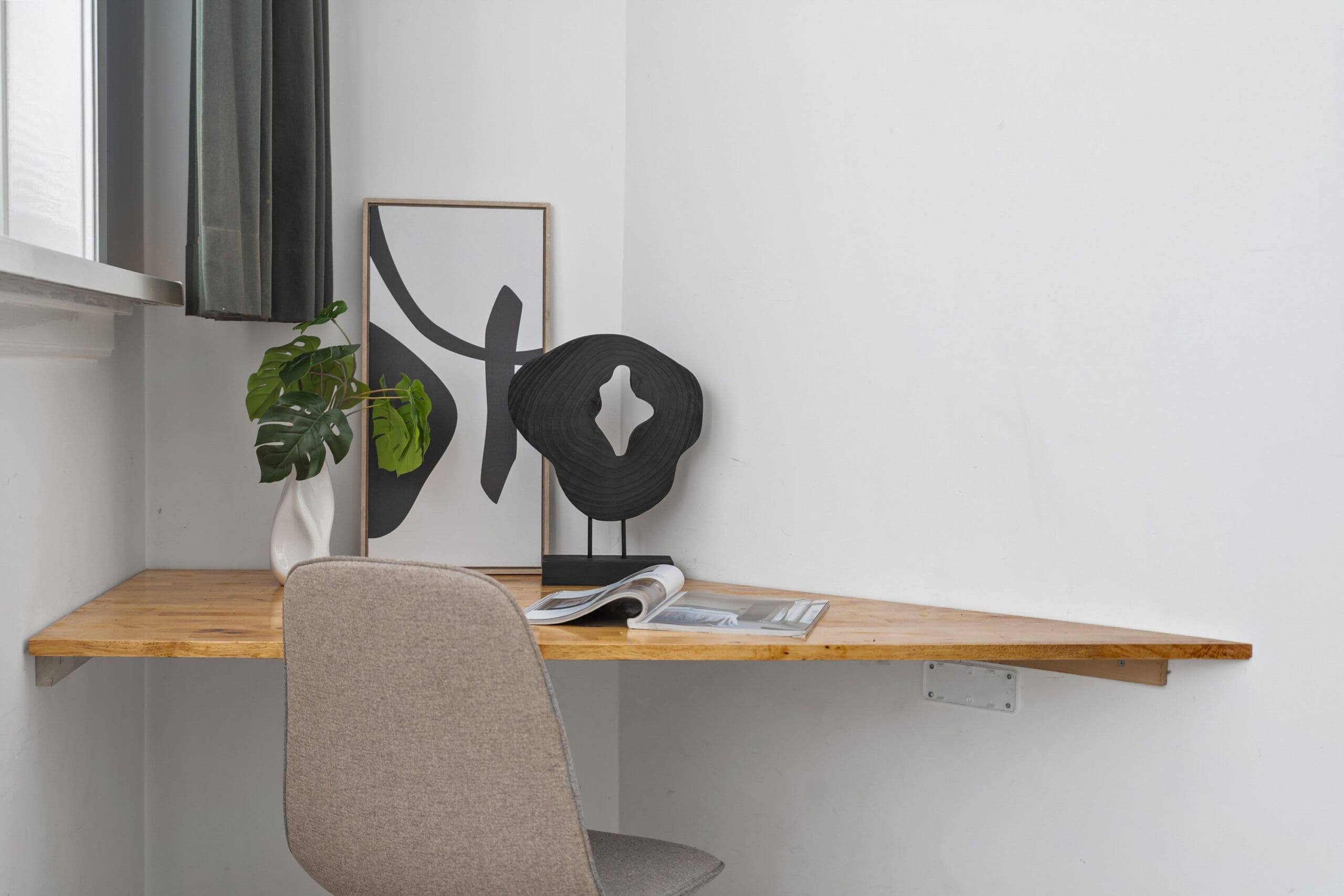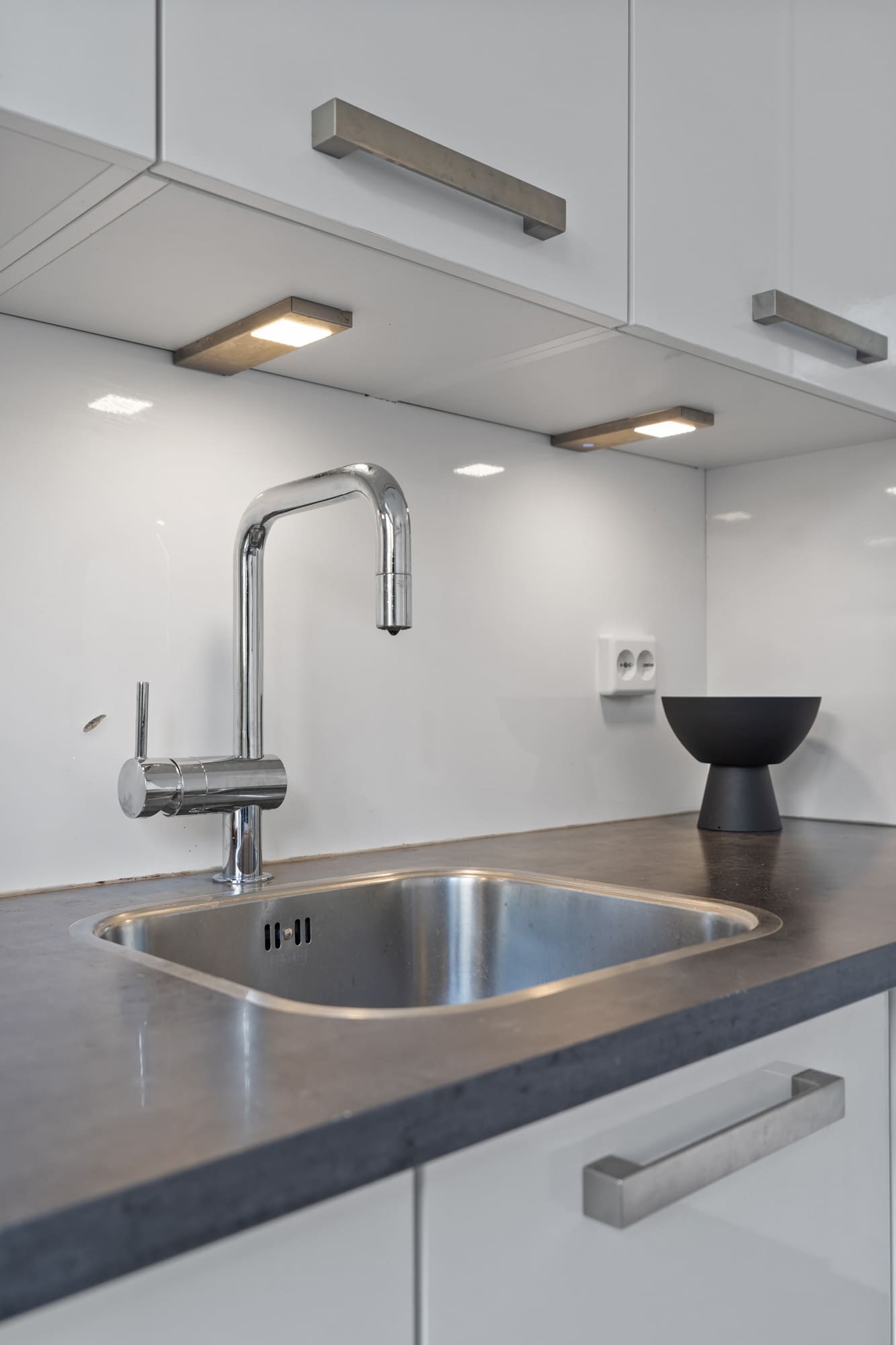 The kitchen, also at the rear, is fitted with a dishwasher, 4-burner gas stove, oven, and fridge/freezer. There’s also a washing machine connection. A wall-mounted breakfast bar is located opposite the countertop – the perfect spot for your morning coffee or a glass of wine while cooking. The kitchen also provides direct access to the terrace. The west-facing terrace enjoys afternoon and evening sun and borders the well-maintained, peaceful communal garden of the homeowners' association (VvE), giving you a sense of privacy and greenery. A utility cabinet on the terrace keeps the central heating system neatly out of sight.