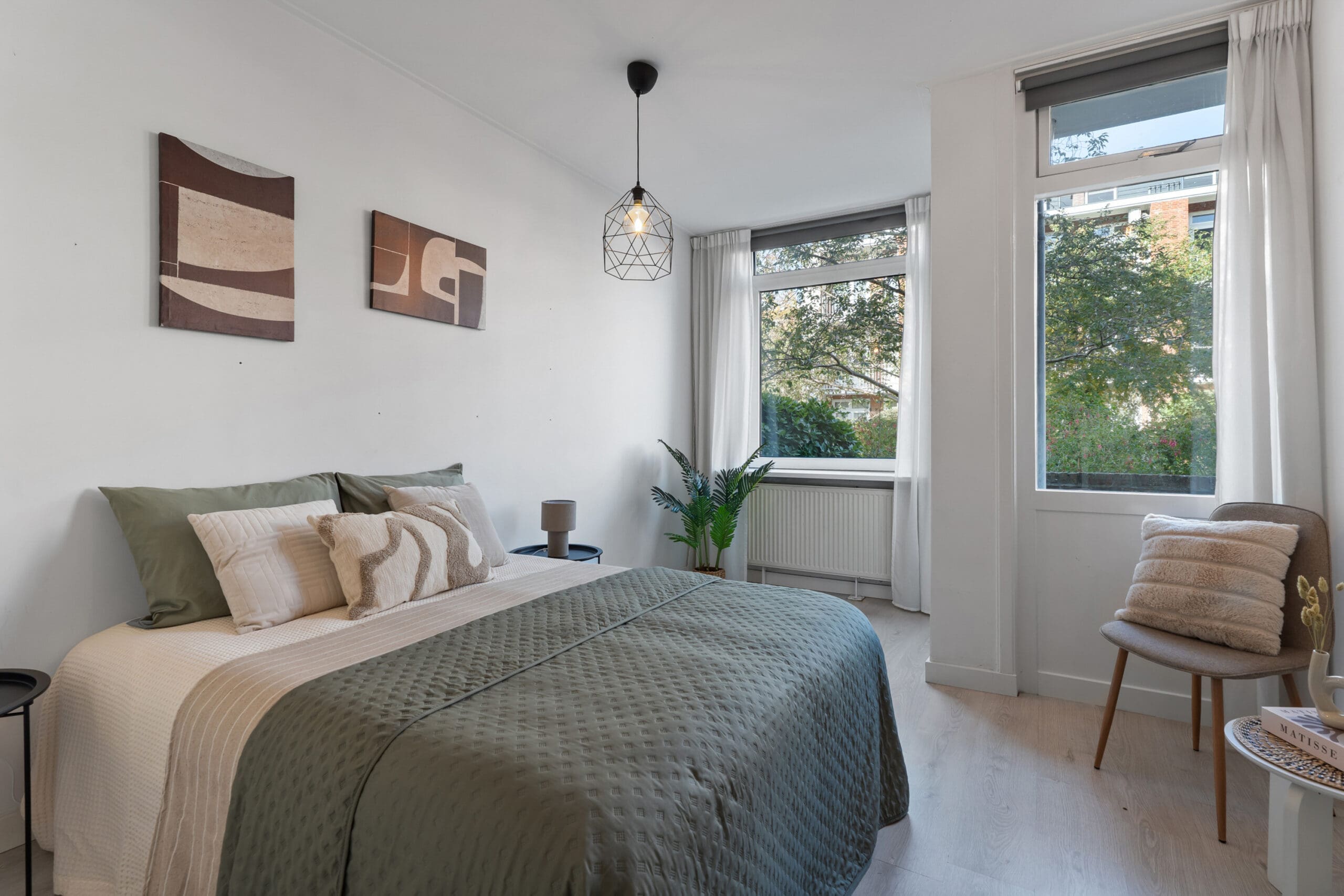 This charming ground floor apartment of approx. 45 m² features a spacious bedroom, a bright living room at the front, and a separate kitchen at the rear with access to a west-facing terrace. The view? A beautifully maintained and quiet communal garden – your own green oasis in the city. To top it off: the ground lease has been bought off in perpetuity!