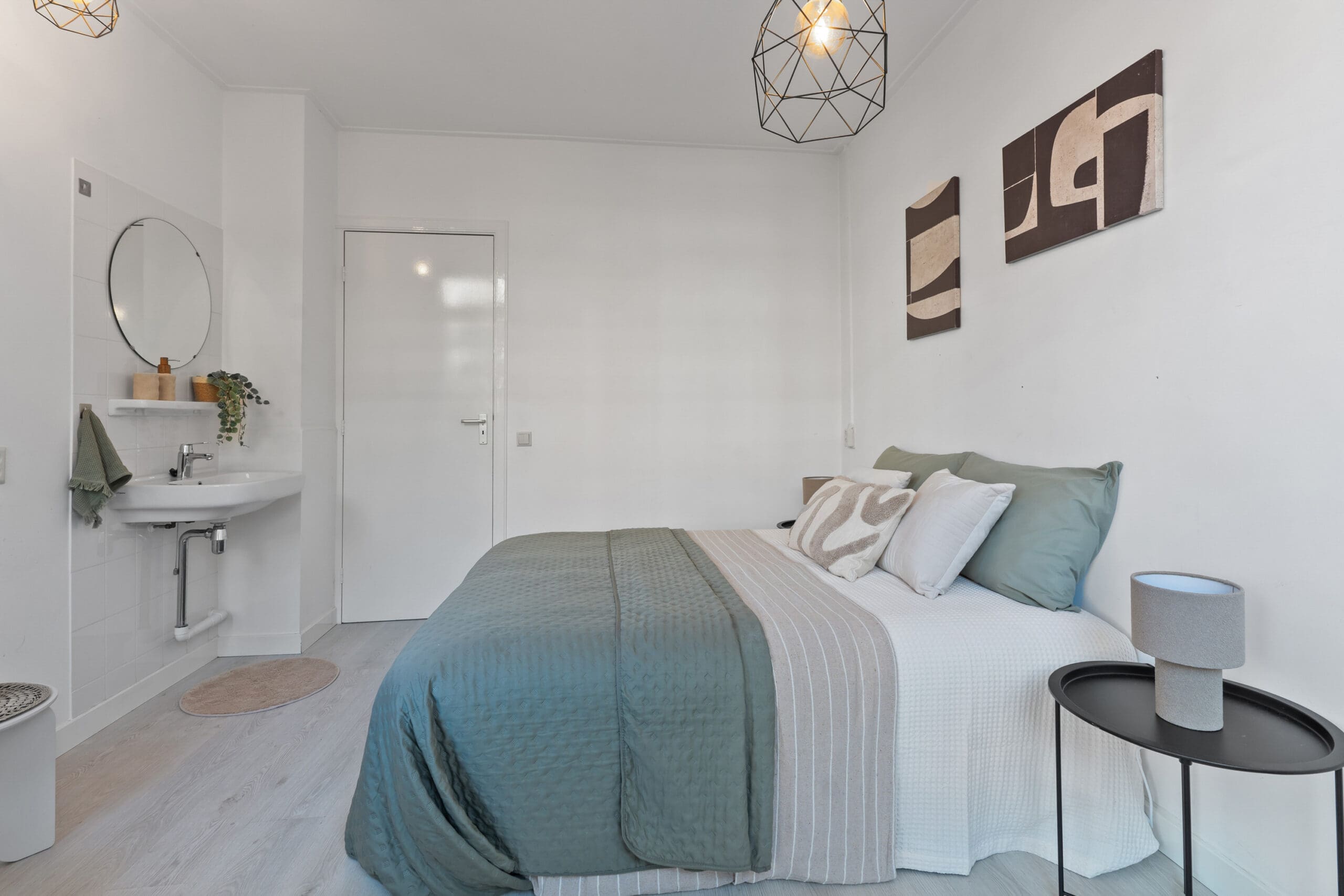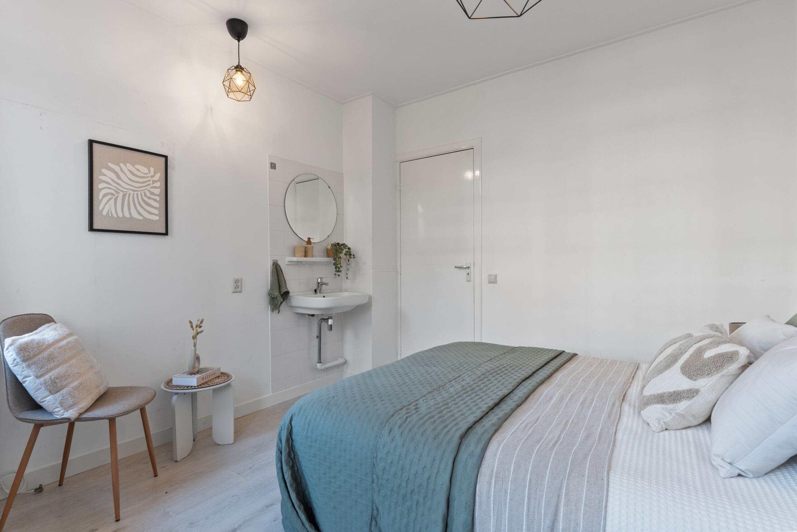 De ruime slaapkamer ligt aan de rustige achterzijde met toegang tot het terras en een wastafel.