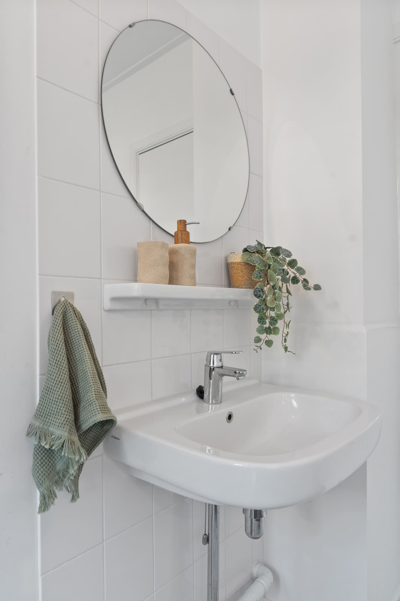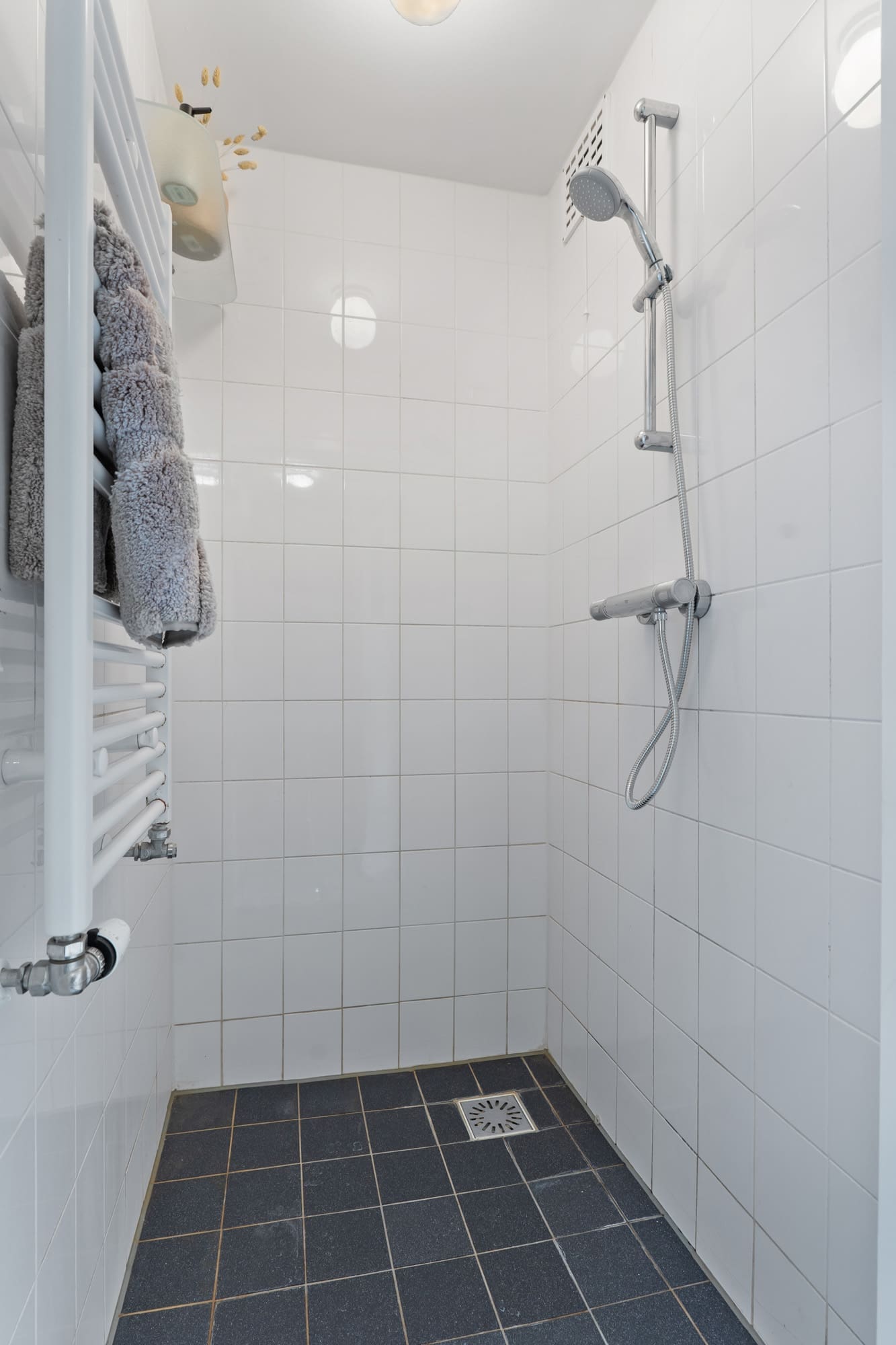 Aan de hal zit een separaat toilet met fontein en apart de badkamer met inloopdouche en handdoekradiator.